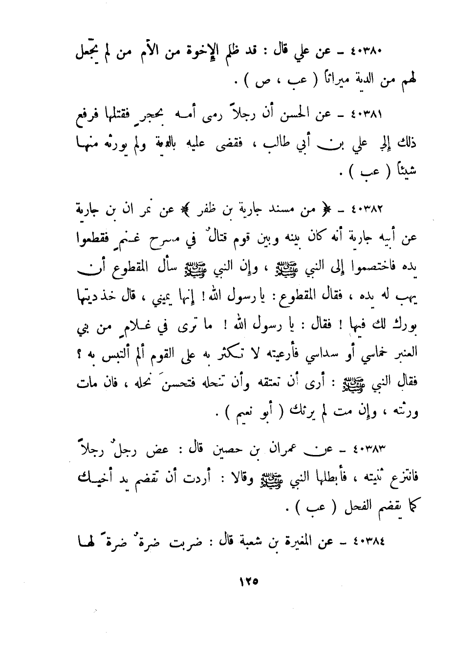 40380- عن علي قال: قد ظلم الإخوة من الأم من لم يجعل لهم من الدية ميراثا."عب، ص".