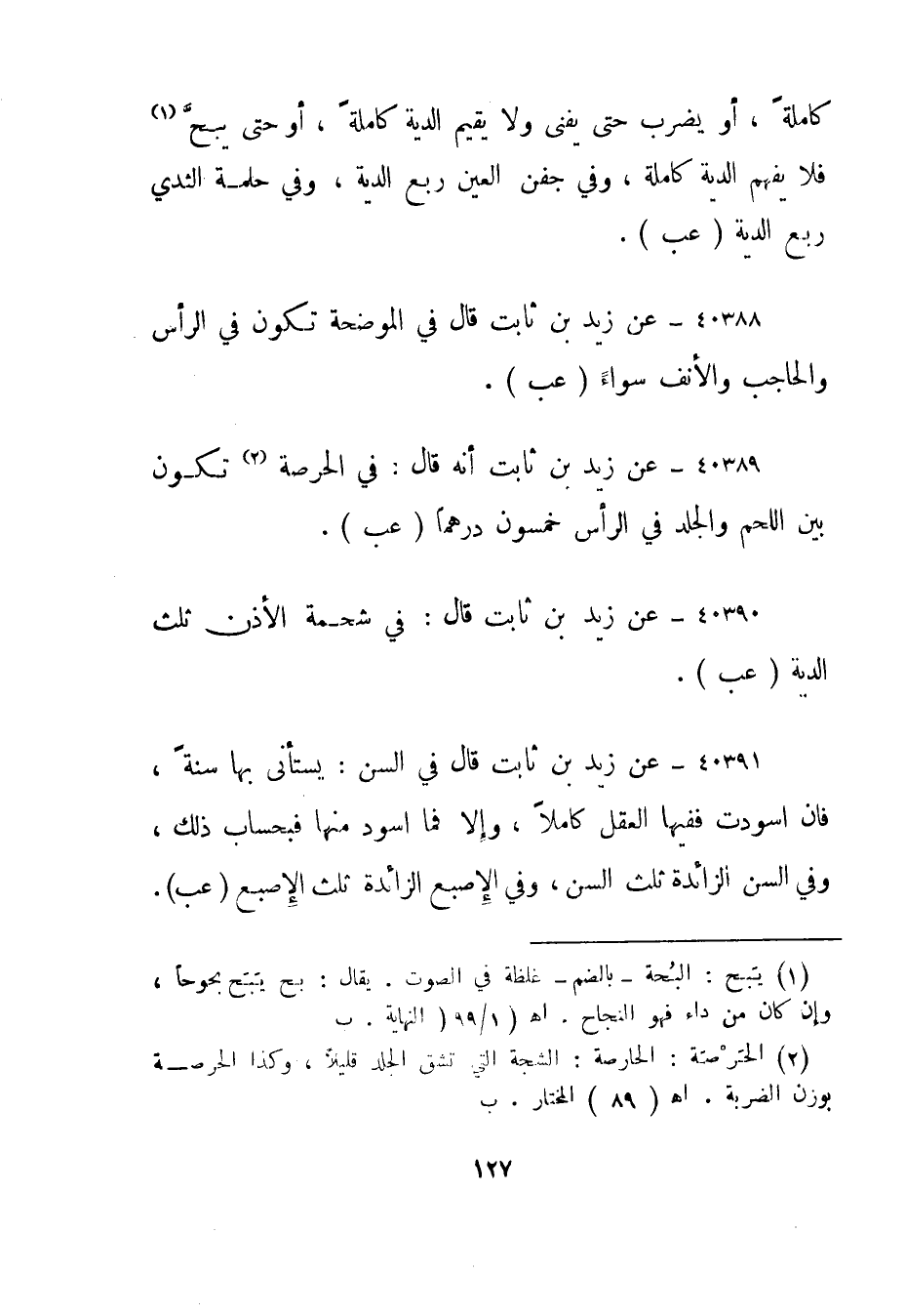 40389- عن زيد بن ثابت أنه قال: في الحرصة "2 تكون بين اللحم والجلد في الرأس خمسون درهما."عب".