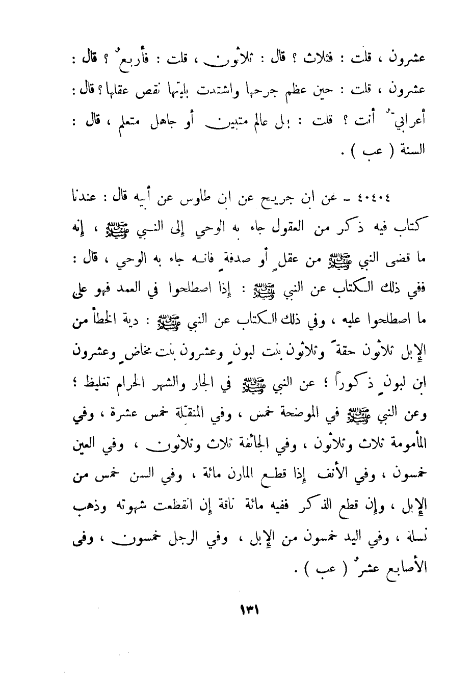 40404- عن ابن جريج عن ابن طاوس عن أبيه قال: عندنا كتاب فيه ذكر من العقول جاء به الوحي إلى النبي صلى الله عليه وسلم، إنه ما قضى النبي صلى الله عليه وسلم من عقل أو صدفة فإنه جاء به الوحي، قال: ففي ذلك الكتاب عن النبي صلى الله عليه وسلم: إذا اصطلحوا في العمد فهو على ما اصطلحوا عليه، وفي ذلك الكتاب عن النبي صلى الله عليه وسلم: دية الخطأ من الإبل ثلاثون حقة وثلاثون بنت لبون وعشرون بنت مخاض وعشرون ابن لبون ذكورا؛ عن النبي صلى الله عليه وسلم في الجار والشهر الحرام تغليظ؛ وعن النبي صلى الله عليه وسلم في الموضحة خمس، وفي المنقلة خمس عشرة، وفي المأمومة ثلاث وثلاثون، وفي الجائفة ثلاث وثلاثون، وفي العين خمسون، وفي الأنف إذا قطع المارن مائة، وفي السن خمس من الإبل، وإن قطع الذكر ففيه مائة ناقة إن انقطعت شهوته وذهب نسلة، وفي اليد خمسون من الإبل، وفي الرجل خمسون، وفي الأصابع عشر."عب".