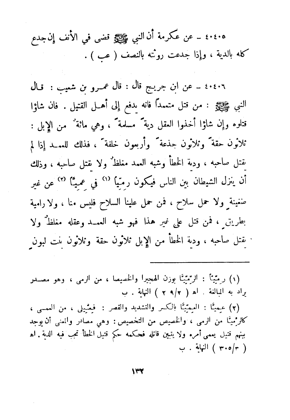 40406- عن ابن جريج قال: قال عمرو بن شعيب: قال النبي صلى الله عليه وسلم: "من قتل متعمدا فإنه يدفع إلى أهل القتيل، فإن شاؤا قتلوه وإن شاؤا أخذوا العقل دية مسلمة، وهي مائة من الإبل: ثلاثون حقة وثلاثون جذعة وأربعون خلفة، فذلك للعمد إذا لم يقتل صاحبه، ودية الخطأ وشبه العمد مغلظ ولا يقتل صاحبه، وذلك أن ينزل الشيطان بين الناس فيكون رميا 1 في عميا 2 عن غير ضغينة ولا حمل سلاح، فمن حمل علينا السلاح فليس منا، ولا رامية بطريق، فمن قتل على غير هذا فهو شبه العمد وعقله مغلظ ولا يقتل صاحبه، ودية الخطأ من الإبل ثلاثون حقة وثلاثون بنت لبون