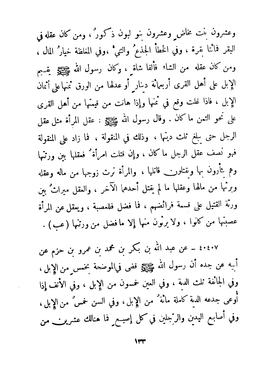 40407- عن عبد الله بن بكر بن محمد بن عمرو بن حزم عن أبيه عن جده أن رسول الله صلى الله عليه وسلم قضى في الموضحة بخمس من الإبل، وفي الجائفة ثلث الدية، وفي العين خمسون من الإبل، وفي الأنف إذا أوعى جدعه الدية كاملة مائة من الإبل، وفي السن خمس من الإبل، وفي أصابع اليدين والرجلين في كل إصبع فما هنالك عشرين من