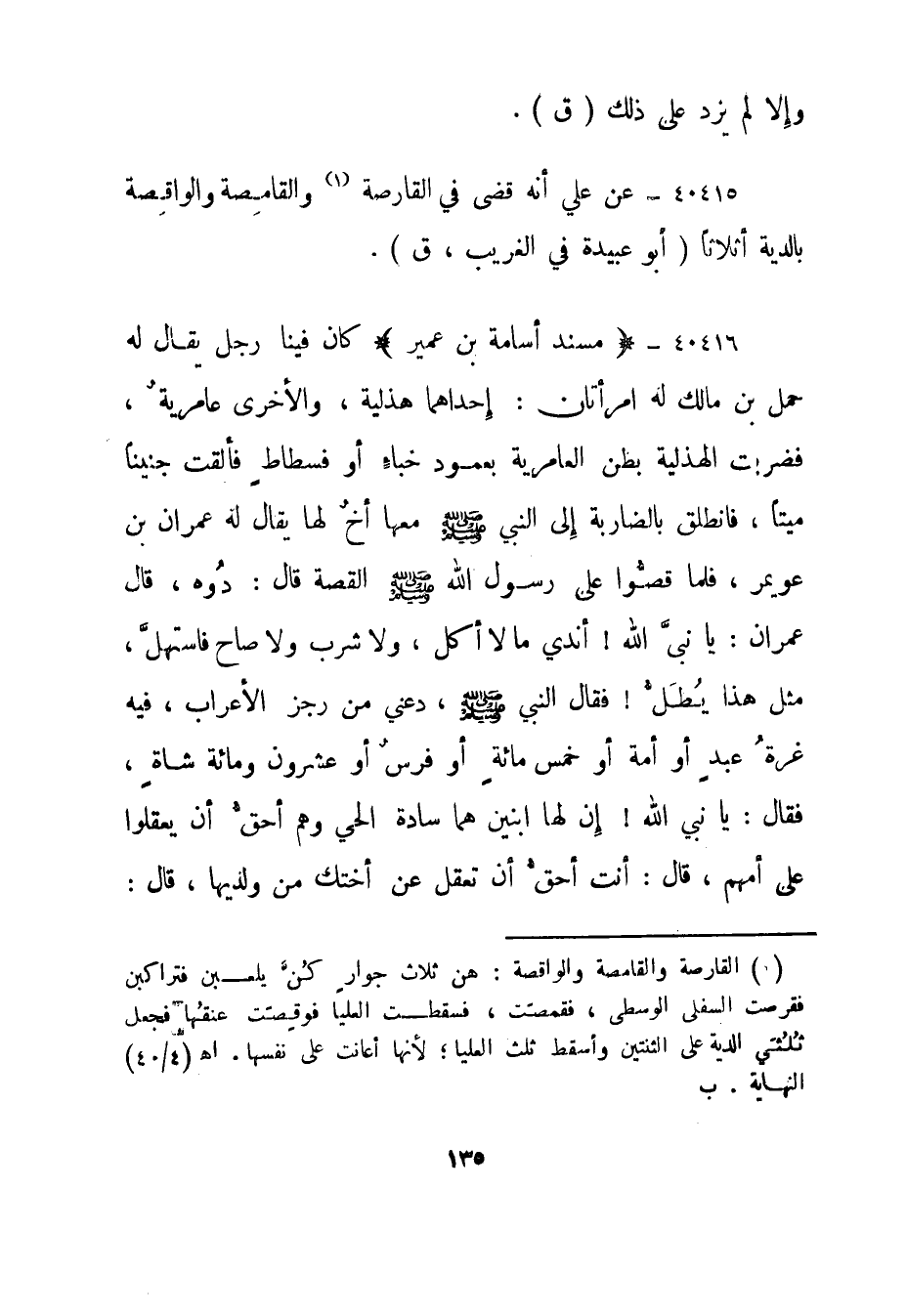 40416-"مسند أسامة بن عمير" كان فينا رجل يقال له حمل بن مالك له امرأتان: إحداهما هذلية، والأخرى عامرية، فضربت الهذلية بطن العامرية بعمود خباء أوفسطاط فألقت جنينا ميتا، فانطلق بالضاربة إلى النبي صلى الله عليه وسلم معها أخ لها يقال له عمران بن عويمر، فلما قصوا على رسول الله صلى الله عليه وسلم القصة قال: "دوه"، قال عمران: يا نبي الله! أندي ما لا أكل، ولا شرب ولا صاح فاستهل، مثل هذا يطل! فقال النبي صلى الله عليه وسلم، "دعني من رجز الأعراب، فيه غرة عبد أو أمة أو خمس مائة أو فرس أو عشرون ومائة شاة"، فقال: يا نبي الله! إن لها ابنين هما سادة الحي وهم أحق أن يعقلوا على أمهم، قال: "أنت أحق أن تعقل عن أختك من ولديها"، قال: