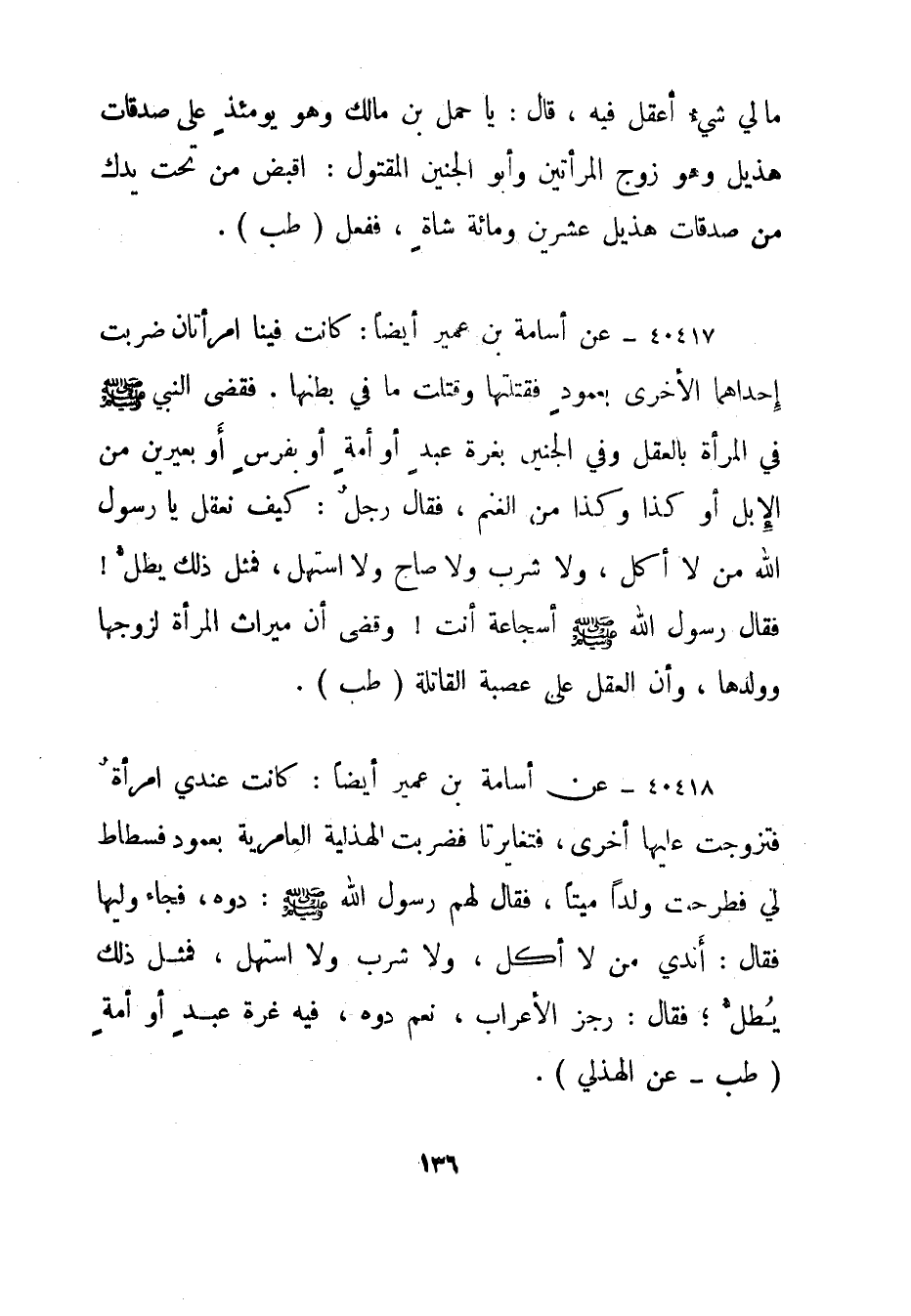 40417- عن أسامة بن عمير أيضا: كانت فينا امرأتان ضربت إحداهما الأخرى بعمود فقتلتها وقتلت ما في بطنها. فقضى النبي صلى الله عليه وسلم في المرأة بالعقل وفي الجنين بغرة عبد أو أمة أو بفرس أو بعيرين من الإبل أو كذا وكذا من الغنم، فقال رجل: كيف نعقل يا رسول الله من لا أكل، ولا شرب ولا صاح ولا استهل، فمثل ذلك يطل! فقال رسول الله صلى الله عليه وسلم "أسجاعة أنت"! وقضى أن ميراث المرأة لزوجها وولدها، وأن العقل على عصبة القاتلة."طب".