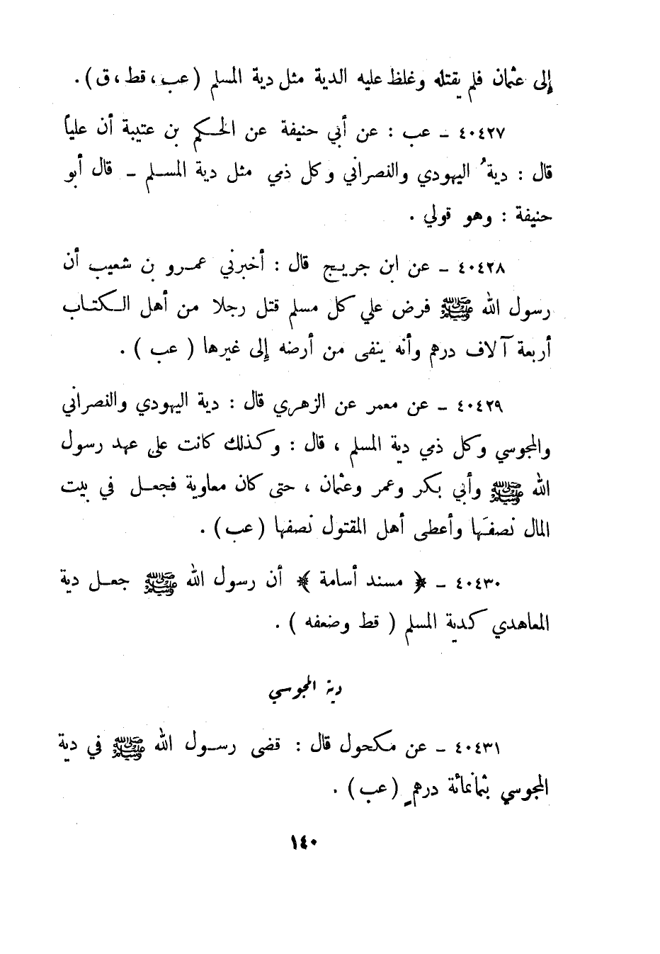 40431- عن مكحول قال: قضى رسول الله صلى الله عليه وسلم في دية المجوسي بثمانمائة درهم."عب".