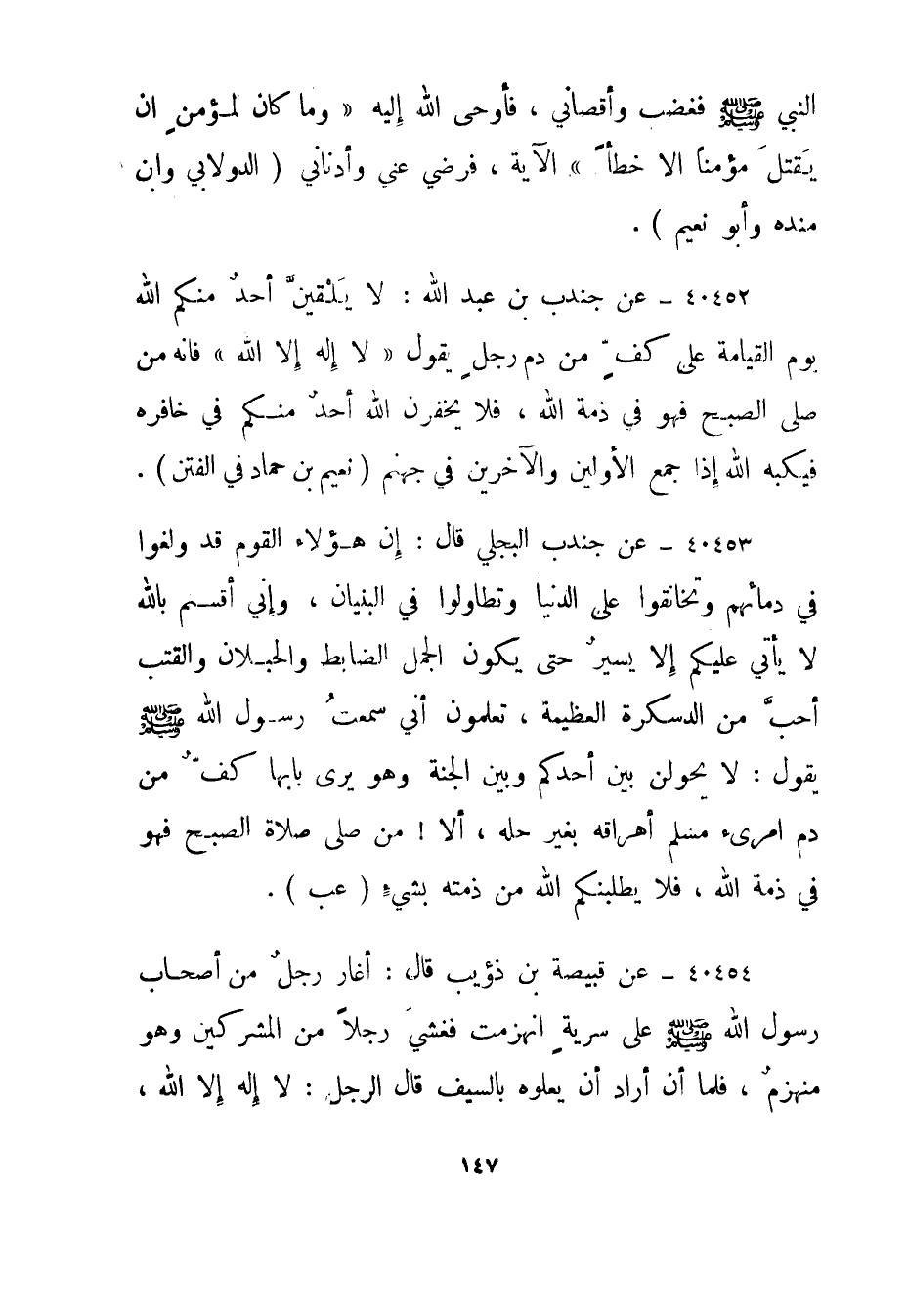 40452- عن جندب بن عبد الله: لا يلقين أحد منكم الله يوم القيامة على كف من دم رجل يقول "لا إله إلا الله" فإنه من صلى الصبح فهو في ذمة الله، فلا يخفرن الله أحد منكم في خافره فيكبه الله إذا جمع الأولين والآخرين في جهنم."نعيم بن حماد في الفتن".