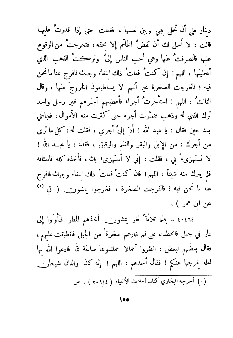 دينار على أن تخلي بيني وبين نفسها، ففعلت حتى إذا قدرت عليها قالت: لا أحل لك أن تفض الخاتم إلا بحقه، فتحرجت من الوقوع عليها فانصرفت عنها وهي أحب الناس إلي وتركت الذهب الذي أعطيتها، اللهم! إن كنت فعلت ذلك ابتغاء وجهك فافرج عنا ما نحن فيه؛ فانفرجت الصخرة غير أنهم لا يستطيعون الخروج منها، وقال الثالث: اللهم! استأجرت أجراء فأعطيتهم أجرهم غير رجل واحد ترك الذي له وذهب فثمرت أجره حتى كثرت منه الأموال، فجاءني بعد حين فقال: يا عبد الله! أد إلي أجري، فقلت له: كل ما ترى من أجرك: من الإبل والغنم والرقيق، فقال: يا عبد الله! لا تستهزئ بي، فقلت: إني لا أستهزئ بك، فأخذه كله فاستاقه فلم يترك منه شيئا، اللهم! فإن كنت فعلت ذلك ابتغاء وجهك فافرج عنا ما نحن فيه؛ فانفرجت الصخرة، فخرجوا يمشون". "ق "1 عن ابن عمر".