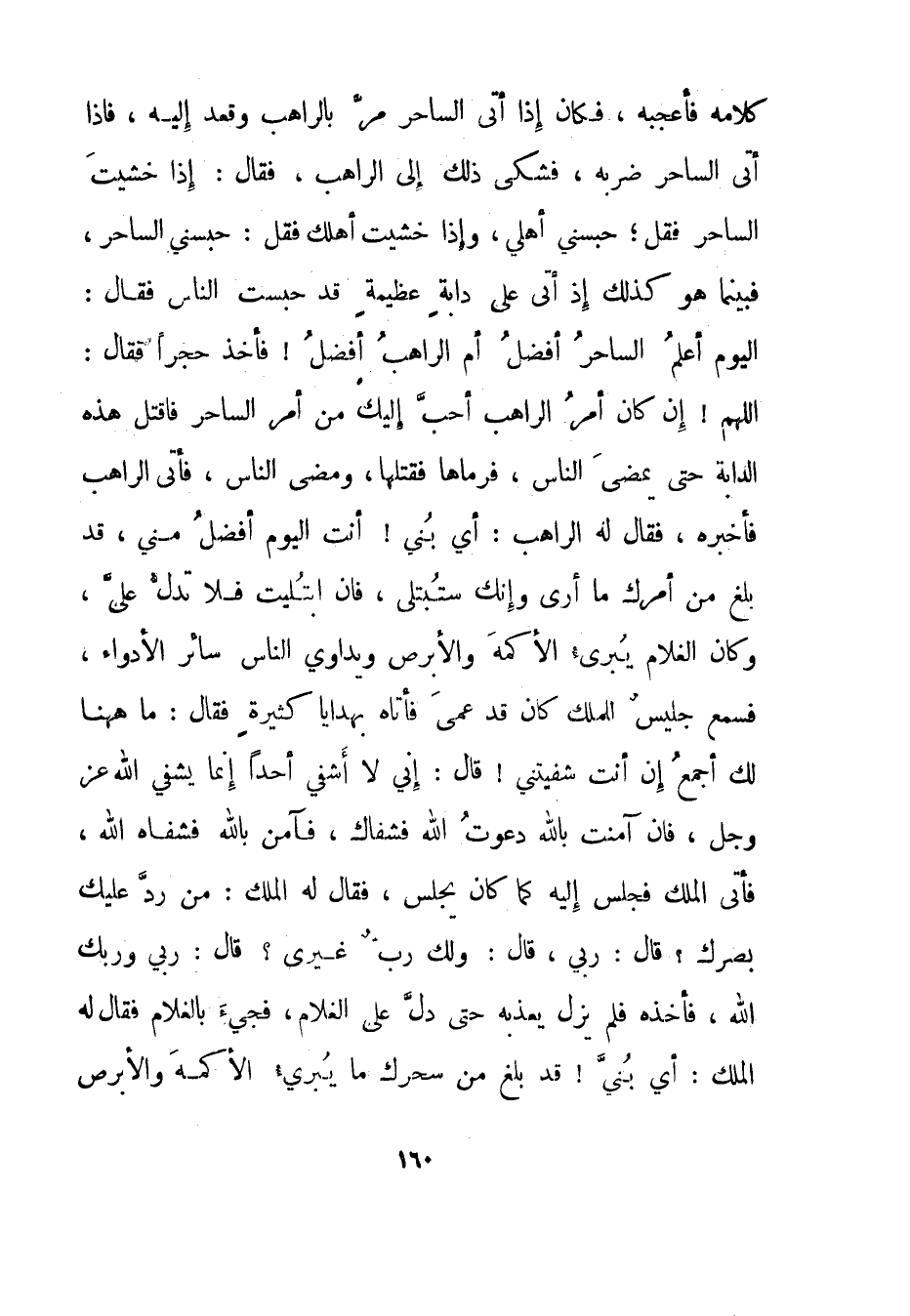 كلامه فأعجبه، فكان إذا أتى الساحر مر بالراهب وقعد إليه، فإذا أتى الساحر ضربه، فشكى ذلك إلى الراهب، فقال: إذا خشيت الساحر فقل؛ حبسني أهلي، وإذا خشيت أهلك فقل: حبسني الساحر، فبينما هو كذلك إذ أتى على دابة عظيمة قد حبست الناس فقال: اليوم أعلم الساحر أفضل أم الراهب أفضل! فأخذ حجرا فقال: اللهم! إن كان أمر الراهب أحب إليك من أمر الساحر فاقتل هذه الدابة حتى يمضى الناس، فرماها فقتلها، ومضى الناس، فأتى الراهب فأخبره، فقال له الراهب: أي بني! أنت اليوم أفضل مني، قد بلغ من أمرك ما أرى وإنك ستبتلى، فإن ابتليت فلا تدل علي، وكان الغلام يبرئ الأكمه والأبرص ويداوي الناس سائر الأدواء، فسمع جليس للملك كان قد عمى فأتاه بهدايا كثيرة فقال: ما ههنا لك أجمع إن أنت شفيتني! قال: إني لا أشفي أحدا إنما يشفي الله عز وجل، فإن آمنت بالله دعوت الله فشفاك، فآمن بالله فشفاه الله، فأتى الملك فجلس إليه كما كان يجلس، فقال له الملك: من رد عليك بصرك؟ قال: ربي، قال: ولك رب غيرى؟ قال: ربي وربك الله. فأخذه فلم يزل يعذبه حتى دل على الغلام، فجيء بالغلام فقال له الملك: أي بني! قد بلغ من سحرك ما يبرئ الأكمه والأبرص