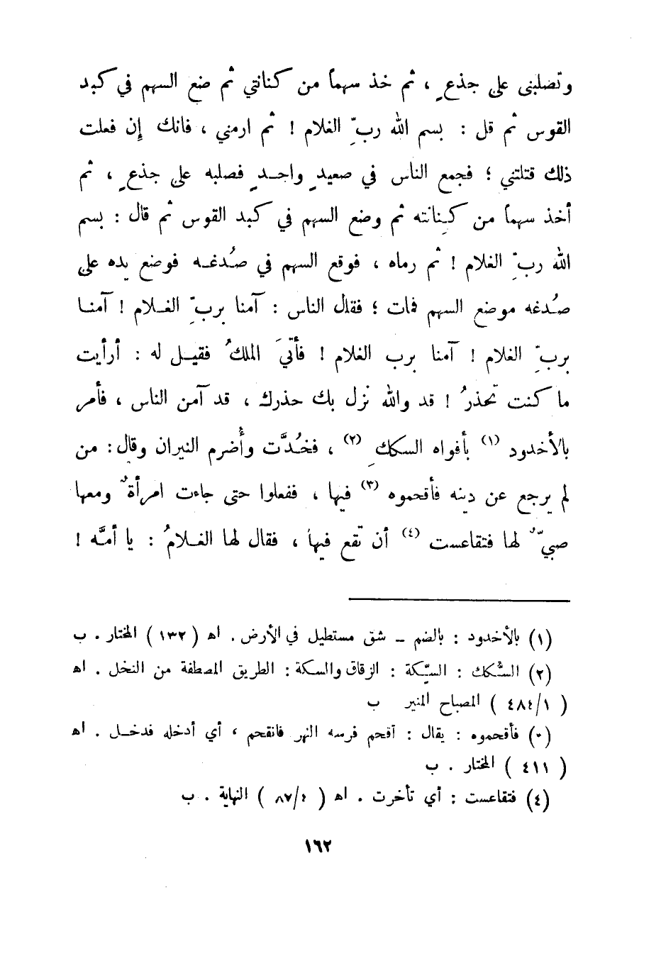 وتصلبني على جذع، ثم خذ سهما من كنانتي ثم ضع السهم في كبد القوس ثم قل: بسم الله رب الغلام! ثم ارمني، فإنك إن فعلت ذلك قتلتني؛ فجمع الناس في صعيد واحد فصلبه على جذع، ثم أخذ سهما من كنانته ثم وضع السهم في كبد القوس ثم قال: بسم الله رب الغلام! ثم رماه، فوقع السهم في صدغه فوضع يده على صدغه موضع السهم فمات؛ فقال الناس: آمنا برب الغلام! آمنا برب الغلام! آمنا برب الغلام! فأتي الملك فقيل له: أرأيت ما كنت تحذر! قد والله نزل بك حذرك، قد آمن الناس، فأمر بالأخدود "1 بأفواه السكك "2، فخدت وأضرم النيران وقال: من لم يرجع عن دينه فأقحموه "3 فيها، ففعلوا حتى جاءت امرأة ومعها صبي لها فتقاعست "4 أن تقع فيها، فقال لها الغلام: يا أمه!