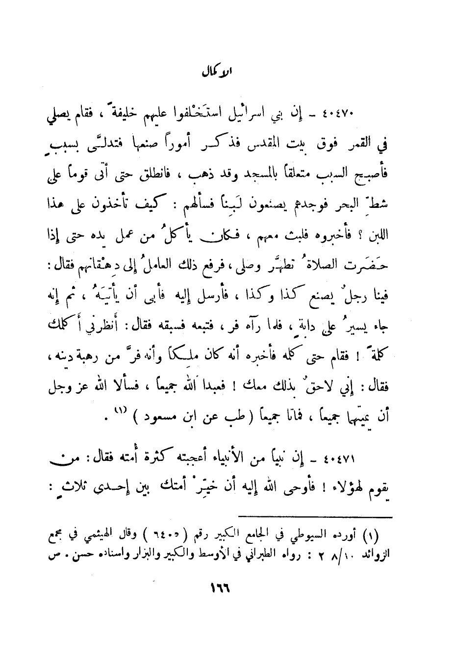 40470- "إن بني إسرائيل استخلفوا عليهم خليفة، فقام يصلي في القمر فوق بيت المقدس فذكر أمورا صنعها فتدلى بسبب فأصبح السبب متعلقا بالمسجد وقد ذهب، فانطلق حتى أتى قوما على شط البحر فوجدهم يصنعون لبنا فسألهم: كيف تأخذون على هذا اللبن؟ فأخبروه فلبث معهم، فكان يأكل من عمل يده حتى إذا حضرت الصلاة تطهر وصلى، فرفع ذلك العامل إلى دهقانهم فقال: فينا رجل يصنع كذا وكذا، فأرسل إليه فأبى أن يأتيه، ثم إنه جاء يسير على دابة، فلما رآه فر، فتبعه فسبقه فقال: أنظرني أكلمك كلمة! فقام حتى كلمه فأخبره أنه كان ملكا وأنه فر من رهبة دينه، فقال: إني لاحق بذلك معك! فعبدا الله جميعا، فسألا الله عز وجل أن يميتهما جميعا، فماتا جميعا". "طب عن ابن مسعود" "1