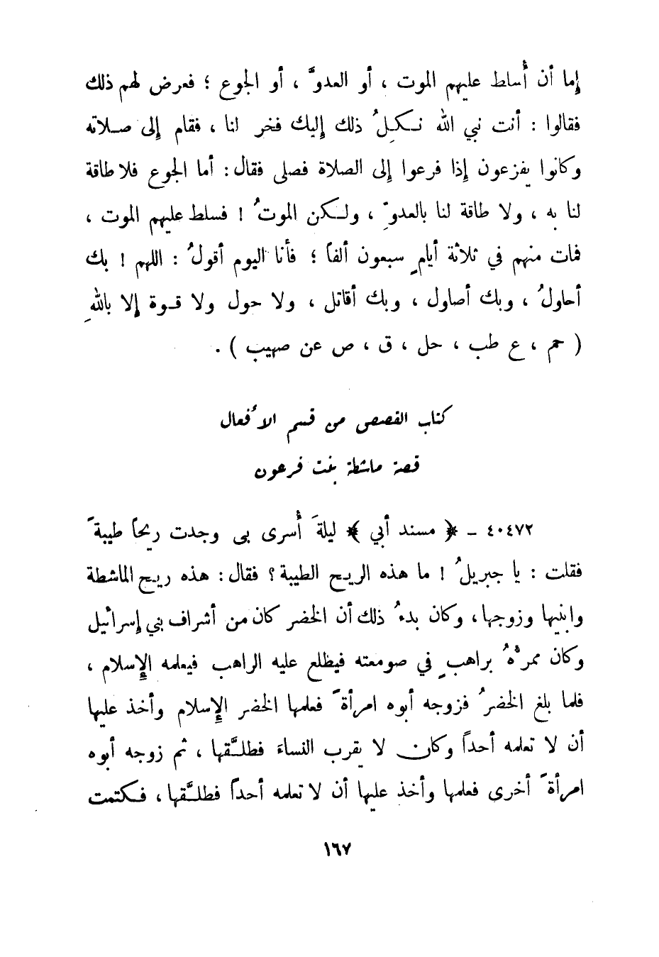 40472- "مسند أبي" "ليلة أسرى بي وجدت ريحا طيبة فقلت: يا جبريل! ما هذه الريح الطيبة؟ فقال: هذه ريح الماشطة وابنيها وزوجها، وكان بدء ذلك أن الخضر كان من أشراف بني إسرائيل وكان ممره براهب في صومعته فيطلع عليه الراهب فيعلمه الإسلام، فلما بلغ الخضر فزوجه أبوه امرأة فعلمها الخضر الإسلام وأخذ عليها أن لا تعلمه أحدا وكان لا يقرب النساء فطلقها، ثم زوجه أبوه امرأة أخرى فعلمها وأخذ عليها أن لا تعلمه أحدا فطلقها، فكتمت