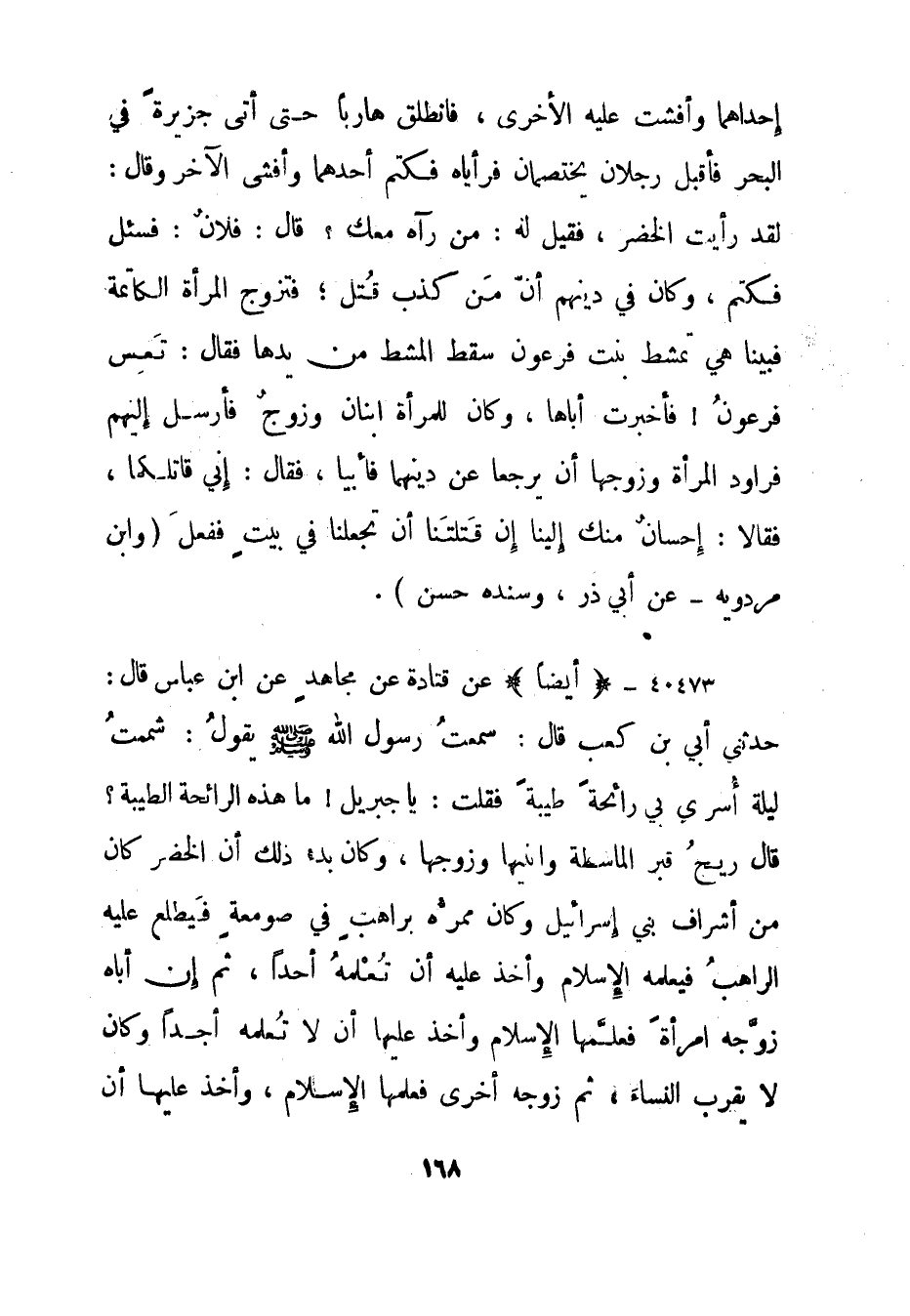 40473- "أيضا" عن قتادة عن مجاهد عن ابن عباس قال: حدثني أبي بن كعب قال: سمعت رسول الله صلى الله عليه وسلم يقول: "شممت ليلة أسري بي رائحة طيبة فقلت: يا جبريل! ما هذه الرائحة الطيبة؟ قال ريح قبر الماشطة وابنيها وزوجها، وكان بدء ذلك أن الخضر كان من أشراف بني إسرائيل وكان ممره براهب في صومعة فيطلع عليه الراهب فيعلمه الإسلام وأخذ عليه أن لا تعلمه أحدا، ثم إن أباه زوجه امرأة فعلمها الإسلام وأخذ عليها أن لا تعلمه أحدا وكان لا يقرب النساء، ثم زوجه أخرى فعلمها الإسلام، وأخذ عليها أن