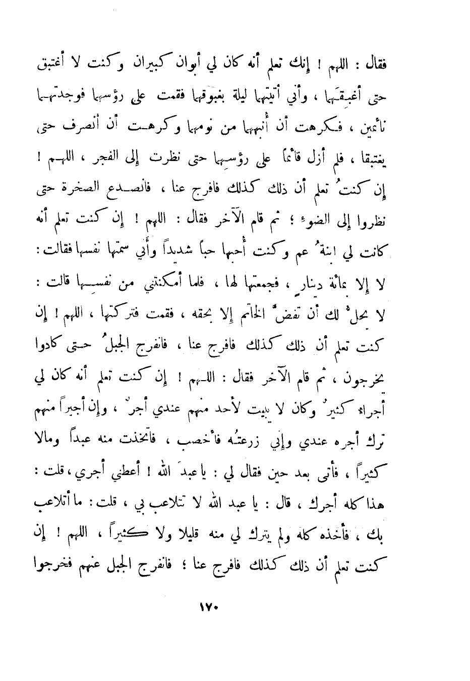 فقال: اللهم! إنك تعلم أنه كان لي أبوان كبيران وكنت لا أغتبق حتى أغبقهما، وأني أتيتهما ليلة بغبوقهما فقمت على رؤسهما فوجدتهما نائمين، فكرهت أن أنبههما من نومهما وكرهت أن أنصرف حتى يغتبقا، فلم أزل قائما على رؤسهما حتى نظرت إلى الفجر، اللهم! إن كنت تعلم أن ذلك كذلك فافرج عنا، فانصدع الصخرة حتى نظروا إلى الضوء؛ ثم قام الآخر فقال: اللهم! إن كنت تعلم أنه كانت لي ابنة عم وكنت أحبها حبا شديدا وأني سمتها نفسها فقالت: لا إلا بمائة دينار، فجمعتها لها، فلما أمكنتني من نفسها قالت: لا يحل لك أن تفض الخاتم إلا بحقه، فقمت فتركتها، اللهم! إن كنت تعلم أن ذلك كذلك فافرج عنا، فانفرج الجبل حتى كادوا يخرجون، ثم قام الآخر فقال: اللهم! إن كنت تعلم أنه كان لي أجراء كثير وكان لا يبيت لأحد منهم عندي أجر، وإن أجيرا منهم ترك أجره عندي وإني زرعته فأخصب، فاتخذت منه عبدا ومالا كثيرا، فأتى بعد حين فقال لي: يا عبد الله! أعطني أجري، قلت: هذا كله أجرك، قال: يا عبد الله لا تتلاعب بي، قلت: ما أتلاعب بك، فأخذه كله ولم يترك لي منه قليلا ولا كثيرا، اللهم! إن كنت تعلم أن ذلك كذلك فافرج عنا؛ فانفرج الجبل عنهم فخرجوا"