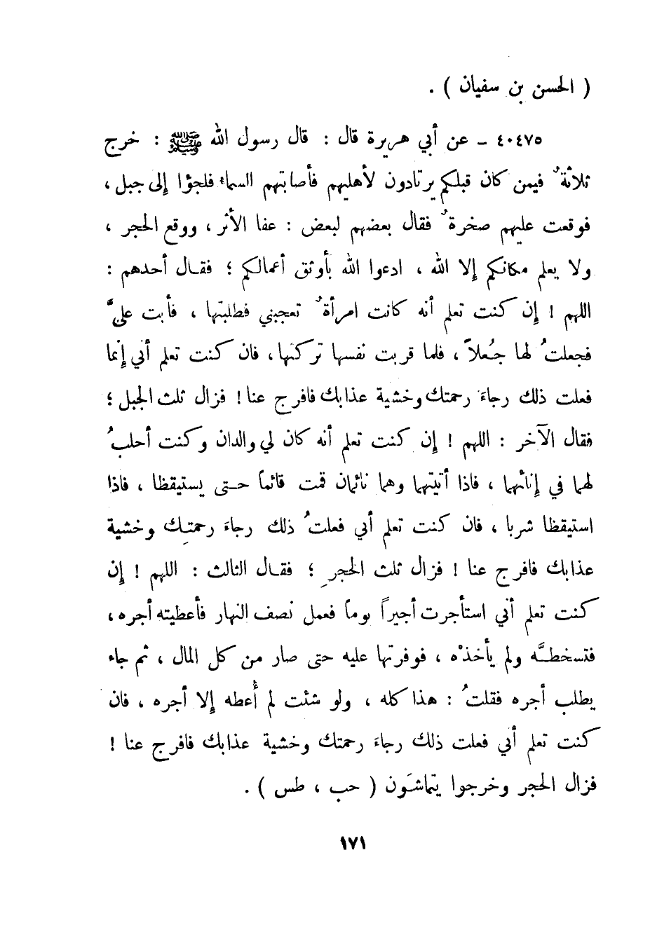 40475- عن أبي هريرة قال: قال رسول الله صلى الله عليه وسلم: "خرج ثلاثة فيمن كان قبلكم يرتادون لأهليهم فأصابتهم السماء فلجؤا إلى جبل، فوقعت عليهم صخرة فقال بعضهم لبعض: عفا الأثر، ووقع الحجر، ولا يعلم مكانكم إلا الله، ادعوا الله بأوثق أعمالكم؛ فقال أحدهم: اللهم! إن كنت تعلم أنه كانت امرأة تعجبني فطلبتها، فأبت علي فجعلت لها جعلا، فلما قربت نفسها تركتها، فإن كنت تعلم أني إنما فعلت ذلك رجاء رحمتك وخشية عذابك فافرج عنا! فزال ثلث الجبل؛ فقال الآخر: اللهم! إن كنت تعلم أنه كان لي والدان وكنت أحلب لهما في إنائهما، فإذا أتيتهما وهما نائمان قمت قائما حتى يستيقظا، فإذا استيقظا شربا، فإن كنت تعلم أني فعلت ذلك رجاء رحمتك وخشية عذابك فافرج عنا! فزال ثلث الحجر؛ فقال الثالث: اللهم! إن كنت تعلم أني استأجرت أجيرا يوما فعمل نصف النهار فأعطيته أجره، فتسخطه ولم يأخذه، فوفرتها عليه حتى صار من كل المال، ثم جاء يطلب أجره فقلت: هذا كله، ولو شئت لم أعطه إلا أجره، فإن كنت تعلم أني فعلت ذلك رجاء رحمتك وخشية عذابك فافرج عنا! فزال الحجر وخرجوا يتماشون". "حب، طس".