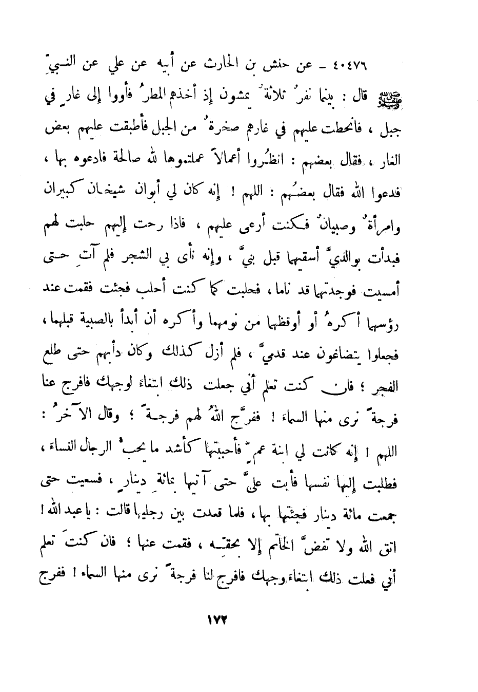 40476- عن حنش بن الحارث عن أبيه عن علي عن النبي صلى الله عليه وسلم قال: "بينما نفر ثلاثة يمشون إذ أخذهم المطر فأووا إلى غار في جبل، فانحطت عليهم في غارهم صخرة من الجبل فأطبقت عليهم بعض الغار، فقال بعضهم: انظروا أعمالا عملتموها لله صالحة فادعوه بها، فدعوا الله فقال بعضهم: اللهم! إنه كان لي أبوان شيخان كبيران وامرأة وصبيان فكنت أرعى عليهم، فإذا رحت إليهم حلبت لهم فبدأت بوالدي أسقيهما قبل بني، وإنه نأى بي الشجر فلم آت حتى أمسيت فوجدتهما قد ناما، فحلبت كما كنت أحلب فجئت فقمت عند رؤسهما أكره أن أوقظهما من نومهما وأكره أن أبدأ بالصبية قبلهما، فجعلوا يتضاغون عند قدمي، فلم أزل كذلك وكان دأبهم حتى طلع الفجر؛ فإن كنت تعلم أني جعلت ذلك ابتغاء لوجهك فافرج عنا فرجة نرى منها السماء! ففرج الله لهم فرجة؛ وقال الآخر: اللهم! إنه كانت لي ابنة عم فأحببتها كأشد ما يحب الرجال النساء، فطلبت إليها نفسها فأبت علي حتى آتيها بمائة دينار، فسعيت حتى جمعت مائة دينار فجئتها بها، فلما قعدت بين رجليها قالت: يا عبد الله! اتق الله ولا تفض الخاتم إلا بحقه، فقمت عنها؛ فإن كنت تعلم أني فعلت ذلك ابتغاء وجهك فافرج لنا فرجة نرى منها السماء! ففرج
