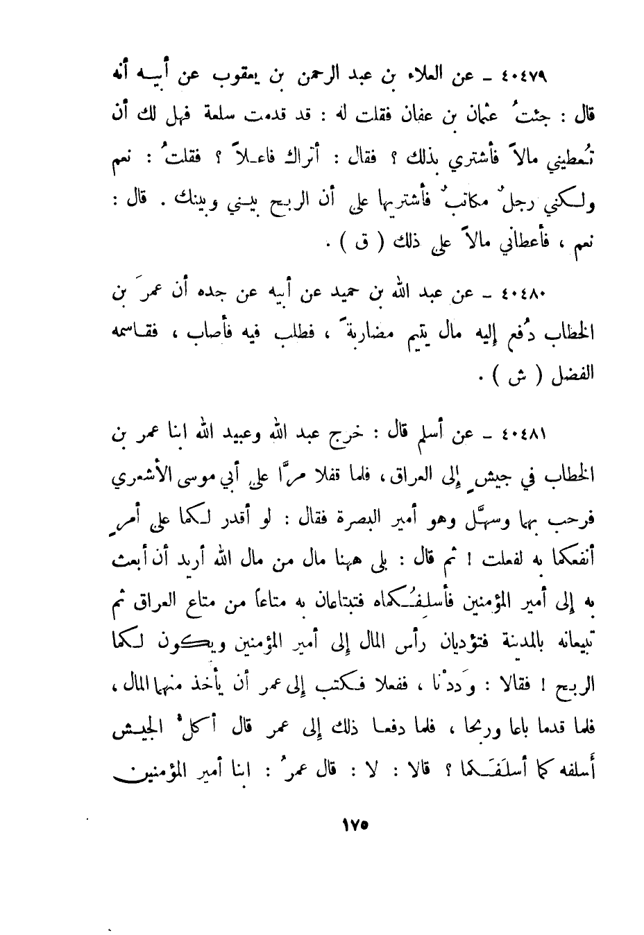 40479- عن العلاء بن عبد الرحمن بن يعقوب عن أبيه أنه قال: جئت عثمان بن عفان فقلت له: قد قدمت سلعة فهل لك أن تعطيني مالا فأشتري بذلك؟ فقال: أتراك فاعلا؟ فقلت: نعم ولكني رجل مكاتب فأشتريها على أن الربح بيني وبينك. قال: نعم، فأعطاني مالا على ذلك."ق".