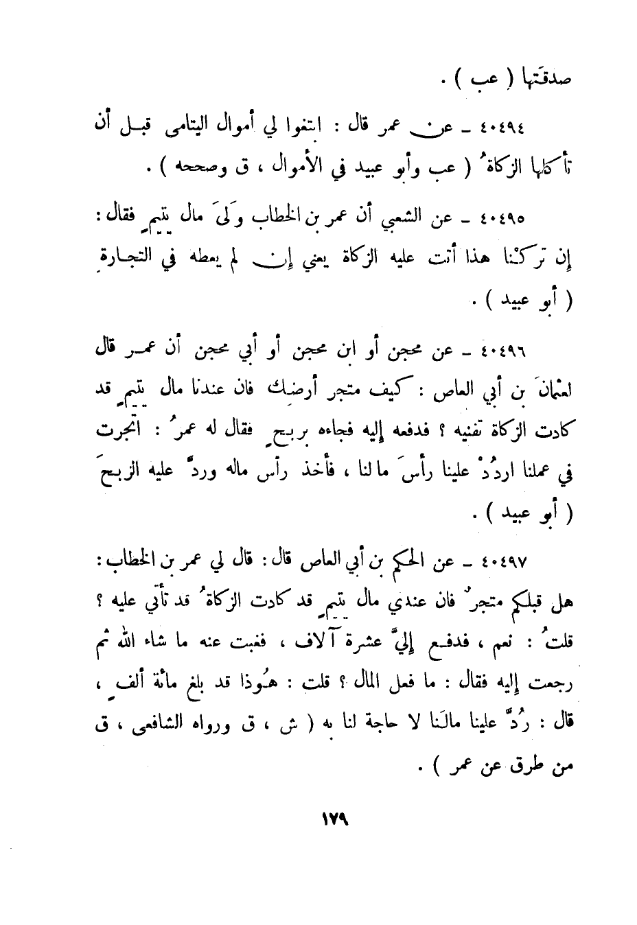 40495- عن الشعبي أن عمر بن الخطاب ولي مال يتيم فقال: إن تركنا هذا أتت عليه الزكاة يعني إن لم يعطه في التجارة."أبو عبيد".