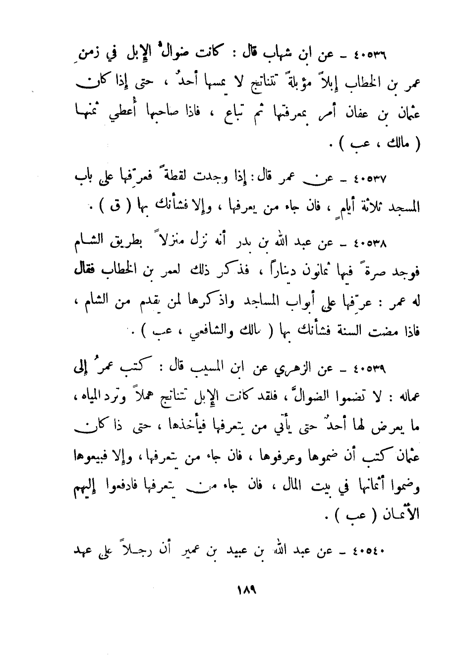 40536- عن ابن شهاب قال: كانت ضوال الإبل في زمن عمر بن الخطاب إبلا مؤبلة تتناتج لا يمسها أحد، حتى إذا كان عثمان بن عفان أمر بمعرفتها ثم تباع، فإذا صاحبها أعطي ثمنها."مالك، عب".