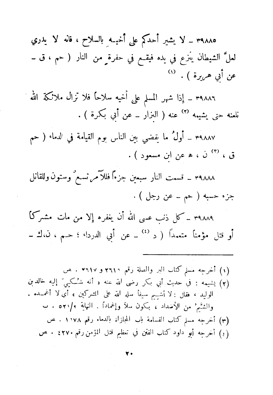 39885- لا يشير أحدكم على أخيه بالسلاح، فإنه لا يدري لعل الشيطان ينزع في يده فيقع في حفرة من النار."حم، ق - عن أبي هريرة" "1