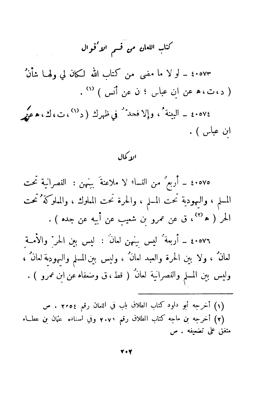40575- أربع من النساء لا ملاعنة بينهن: النصرانية تحت المسلم، واليهودية تحت المسلم، والحرة تحت المملوك، والمملوكة تحت الحر."هـ "2، ق عن عمرو بن شعيب عن أبيه عن جده".