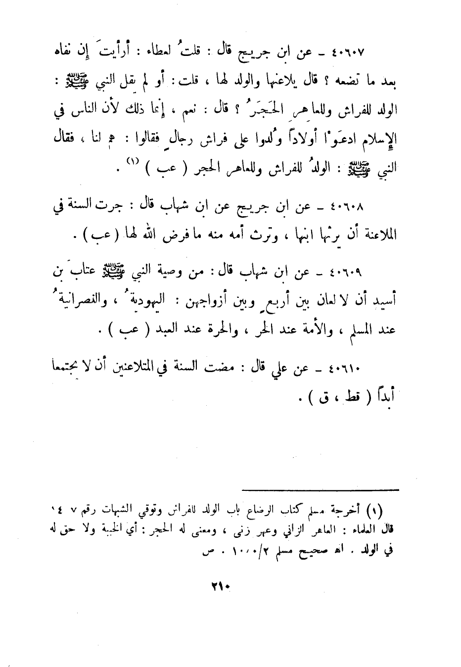40607- عن ابن جريج قال: قلت لعطاء: أرأيت إن نفاه بعد ما تضعه؟ قال يلاعنها والولد لها، قلت: أو لم يقل النبي صلى الله عليه وسلم: "الولد للفراش وللعاهر الحجر"؟ قال: نعم، إنما ذلك لأن الناس في الإسلام ادعوا أولادا ولدوا على فراش رجال فقالوا: هم لنا، فقال النبي صلى الله عليه وسلم: "الولد للفراش وللعاهر الحجر"."عب" "1