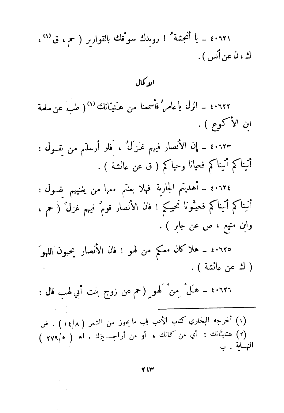 40623- إن الأنصار فيهم غزل، فلو أرسلتم من يقول: أتيناكم أتيناكم فحيانا وحياكم."ق عن عائشة".