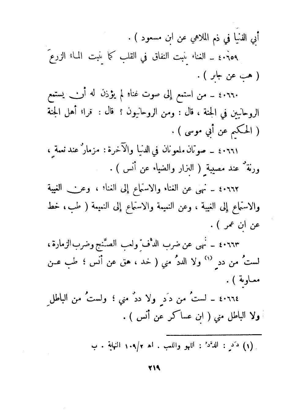 40663- نهى عن ضرب الدف ولعب الصنج وضرب الزمارة، لست من دد "1 ولا الدد مني."خد، هق عن أنس؛ طب عن معاوية".