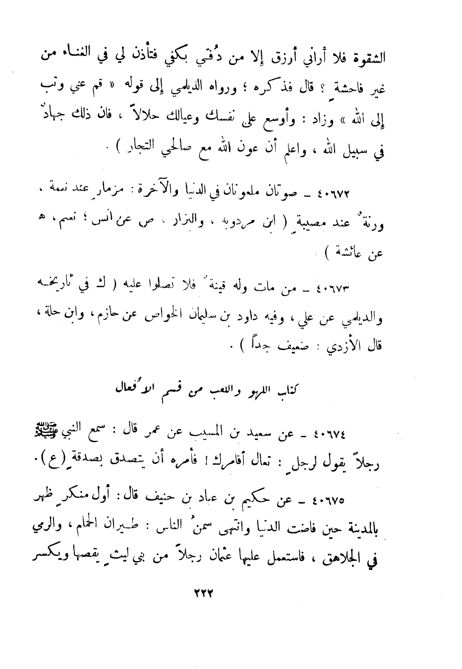 40675- عن حكيم بن عباد بن حنيف قال: أول منكر ظهر بالمدينة حين فاضت الدنيا وانتهى سمن الناس: طيران الحمام، والرمي في الجلاهق، فاستعمل عليها عثمان رجلا من بني ليث يقصها ويكسر