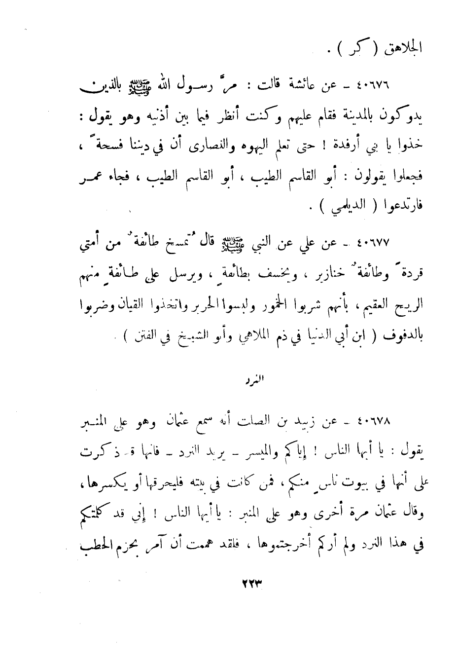 40677- عن علي عن النبي صلى الله عليه وسلم قال تمسخ طائفة من أمتي قردة وطائفة خنازير، ويخسف بطائفة، ويرسل على طائفة منهم الريح العقيم، بأنهم شربوا الخمور ولبسوا الحرير واتخذوا القيان وضربوا بالدفوف."ابن أبي الدنيا في ذم الملاهي وأبو الشيخ في الفتن".