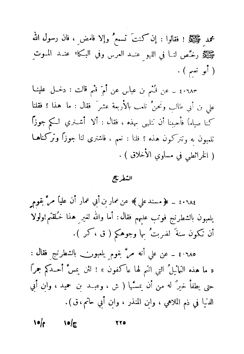 40683- عن قثم بن عباس عن أم قثم قالت: دخل علينا علي بن أبي طالب ونحن نلعب بالأربعة عشر فقال: ما هذا؟ فقلنا كنا صياما فأحببنا أن نتلهى بهذه، فقال: ألا أشتري لكم جوزا تلعبون به وتتركون هذه؟ قلنا: نعم، فاشترى لنا جوزا وتركناها."الخرائطي في مساوي الأخلاق".