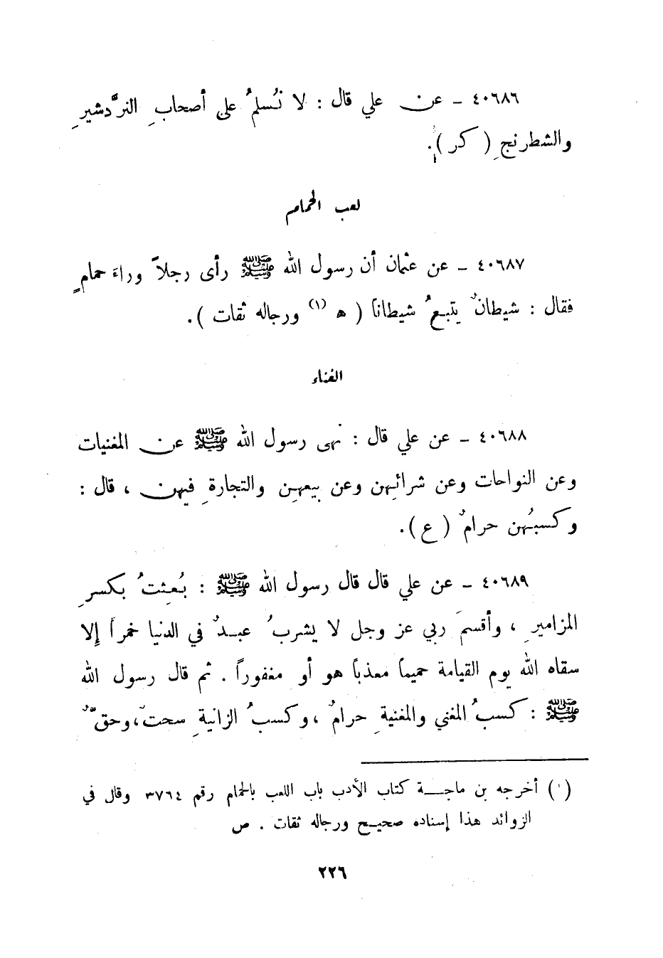 40688- عن علي قال: نهى رسول الله صلى الله عليه وسلم عن المغنيات وعن النواحات وعن شرائهن وعن بيعهن والتجارة فيهن، قال: وكسبهن حرام."ع".