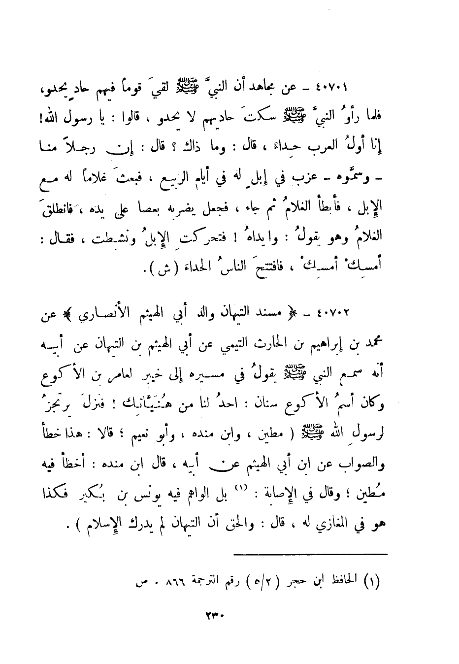 40702- "مسند التيهان والد أبي الهيثم الأنصاري" عن محمد بن إبراهيم بن الحارث التيمي عن أبي الهيثم بن التيهان عن أبيه أنه سمع النبي صلى الله عليه وسلم يقول في مسيره إلى خيبر لعامر بن الأكوع وكان أسم الأكوع سنان: احد لنا من هنياتك! فنزل يرتجز لرسول الله صلى الله عليه وسلم."مطين، وابن منده، وأبو نعيم؛ قالا: هذا خطأ والصواب عن ابن أبي الهيثم عن أبيه، قال ابن منده: أخطأ فيه مطين؛ وقال في الإصابة: "1 بل الواهم فيه يونس بن بكير فكذا هو في المغازي له، قال: والحق أن التيهان لم يدرك الإسلام".