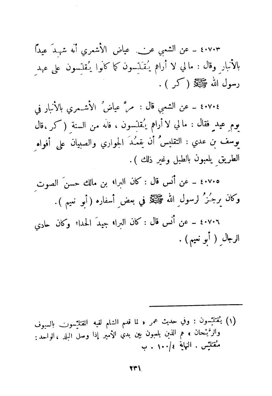 40704- عن الشعبي قال: مر عياض الأشعري بالأنبار في يوم عيد فقال: ما لي لا أراهم يقلسون "1 فإنه من السنة."كر، قال يوسف بن عدي: التقليس أن يقعد الجواري والصبيان على أفواه الطريق يلعبون بالطبل وغير ذلك".