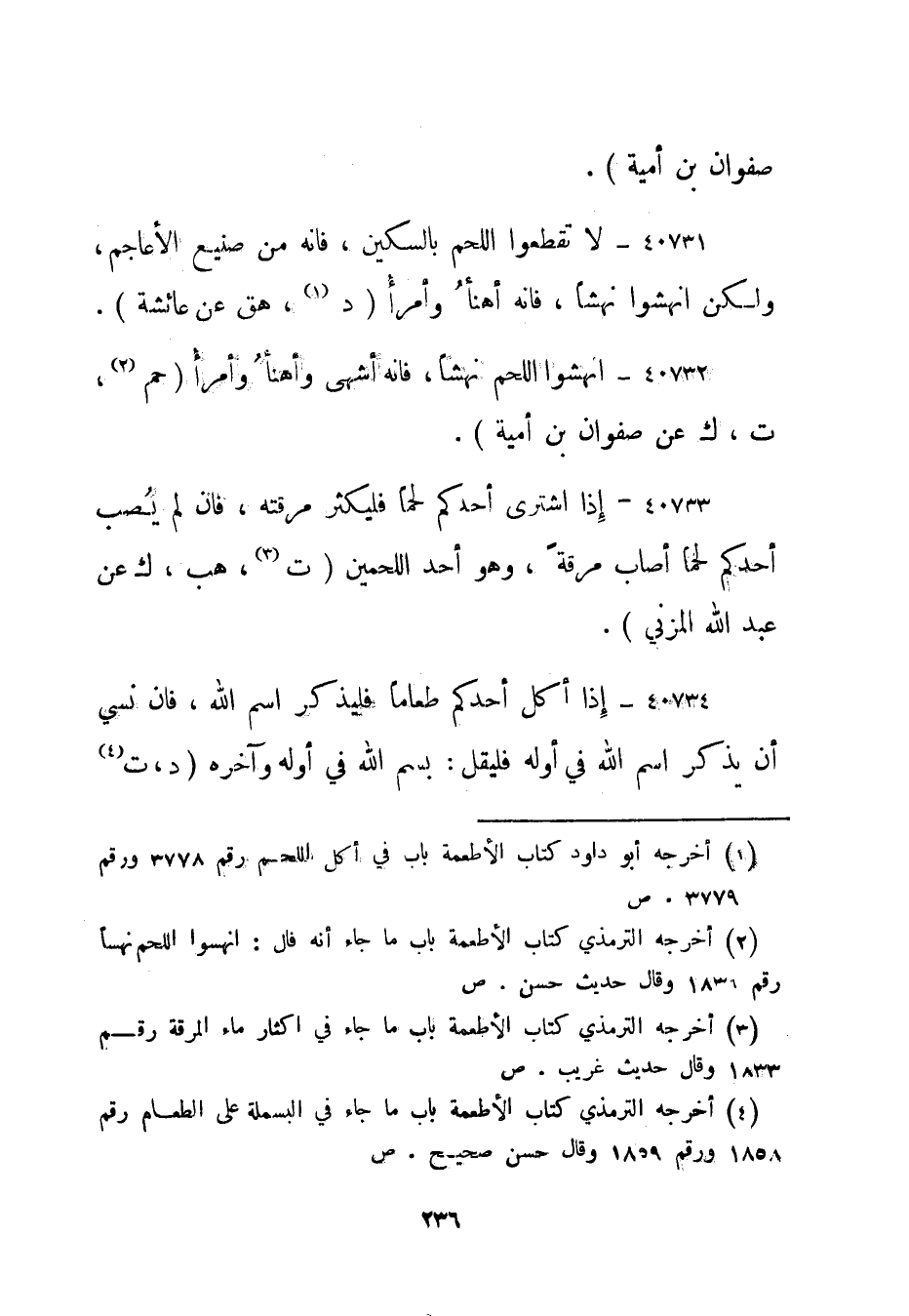 4 أخرجه الترمذي كتاب الأطعمة باب ما جاء في البسملة على الطعام رقم 1858 ورقم 1859 وقال حسن صحيح. ص