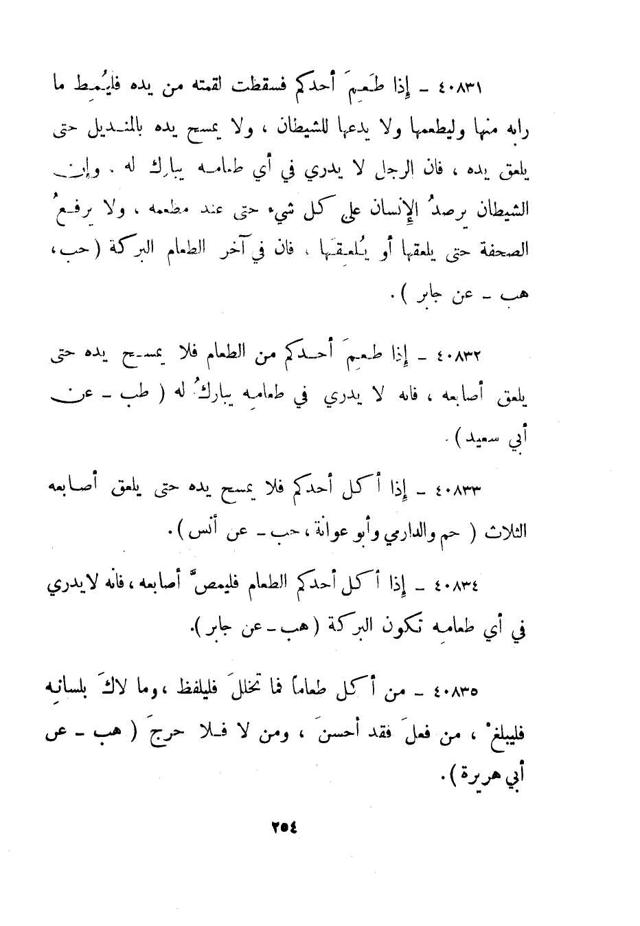 40834- إذا أكل أحدكم الطعام فليمص أصابعه، فإنه لا يدري في أي طعامه تكون البركة."هب - عن جابر".