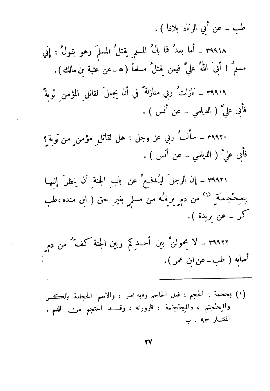 39921- إن الرجل ليدفع عن باب الجنة أن ينظر إليها بمحجمة 1من دم يريقه من مسلم بغير حق."ابن منده، طب كر - عن بريدة".
