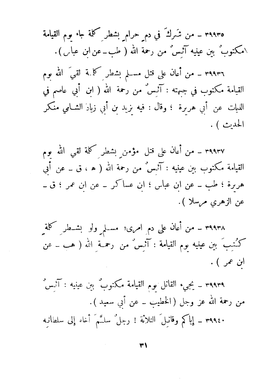 39935- من شرك في دم حرام بشطر كلمة جاء يوم القيامة مكتوب بين عينيه آئس من رحمة الله. "طب - عن ابن عباس".