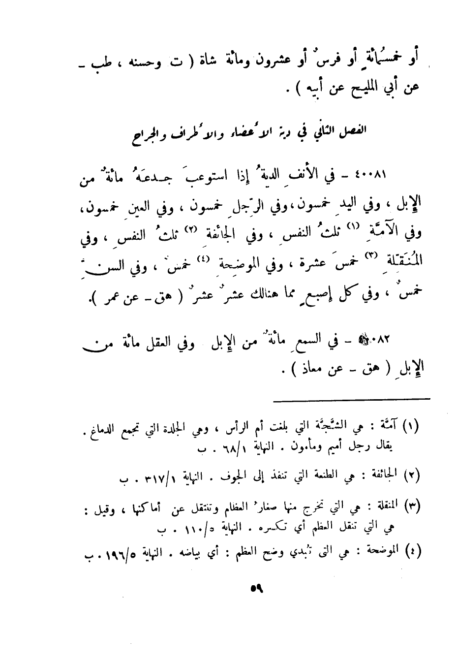 40081- في الأنف الدية إذا استوعب جدعه مائة من الإبل، وفي اليد خمسون، وفي الرجل خمسون، وفي العين خمسون، وفي الآمة "1" ثلث النفس، وفي الجائفة "2 ثلث النفس، وفي المنقلة "3" خمس عشرة، وفي الموضحة "4" خمس، وفي السن خمس، وفي كل إصبع مما هنالك عشر عشر."هق - عن عمر".