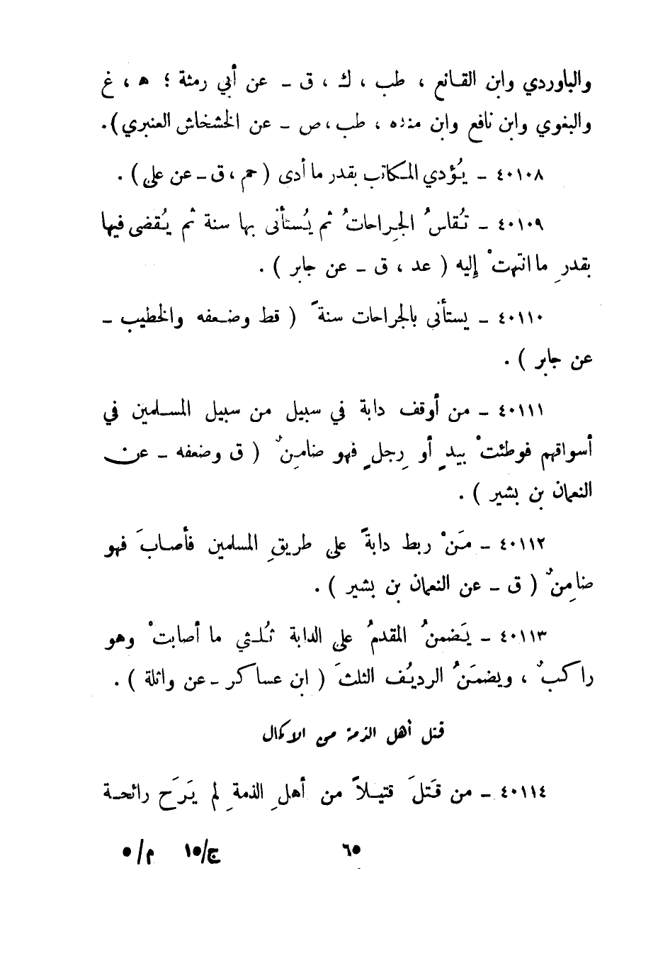 40112- من ربط دابة على طريق المسلمين فأصاب فهو ضامن."ق - عن النعمان بن بشير".