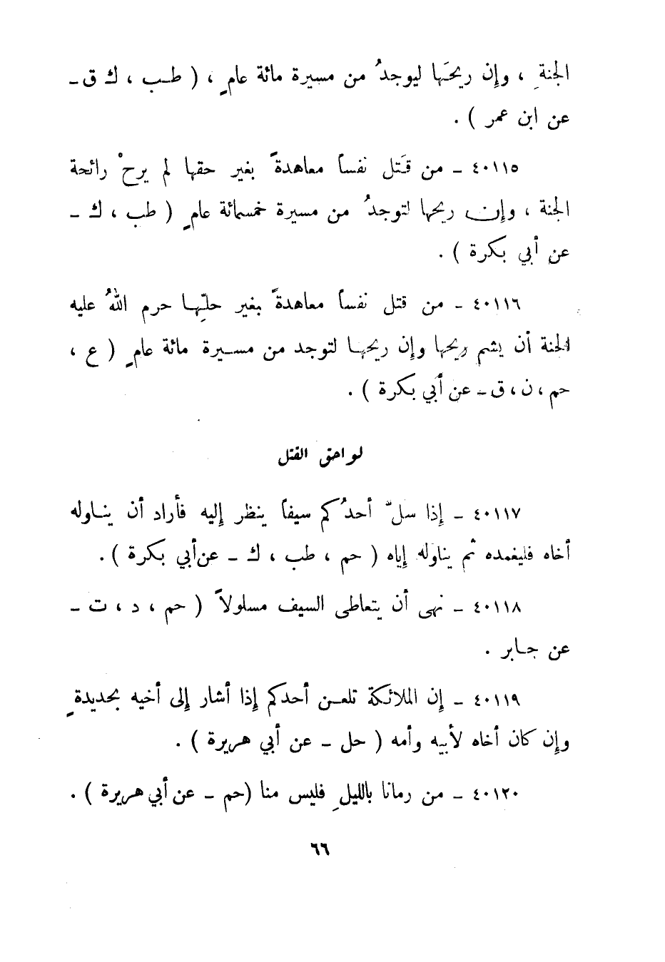 40115- من قتل نفسا معاهدة بغير حقها لم يرح رائحة الجنة، وإن ريحها لتوجد من مسيرة خمسمائة عام."طب، ك - عن أبي بكرة".