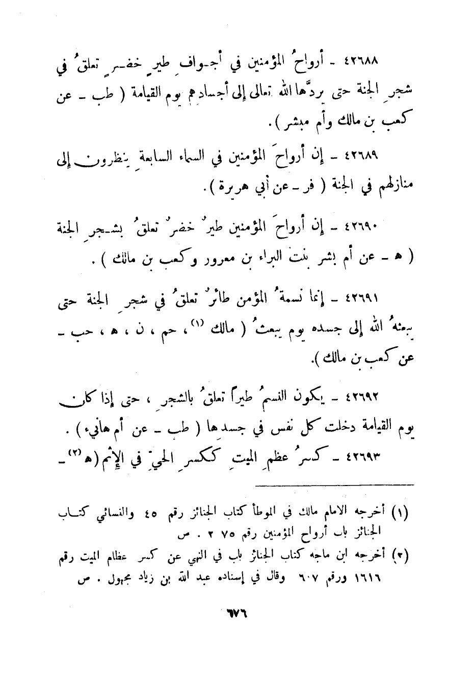 1 أخرجه افمام مالك في الموطأ كتاب الجنائز رقم 45 والنسائي كتاب الجنائز باب أرواح المؤمنين رقم 275. ص
