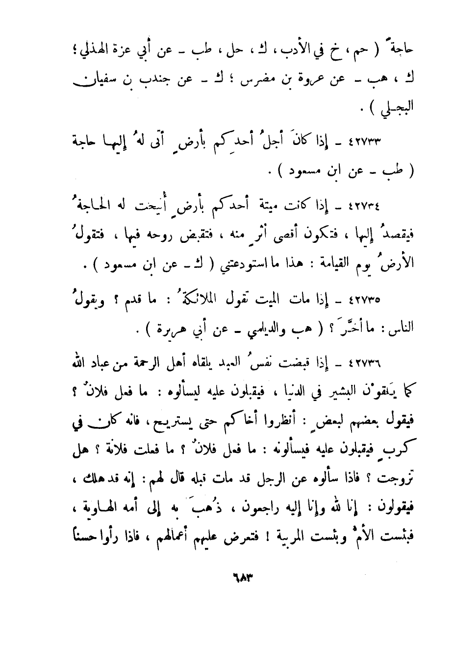 42734- إذا كانت ميتة أحدكم بأرض أنيحت له الحاجة فيقصد إليها، فتكون أقصى أثر منه، فتقبض روحه فيها، فتقول الأرض يوم القيامة: هذا ما استودعتني."ك - عن ابن مسعود".