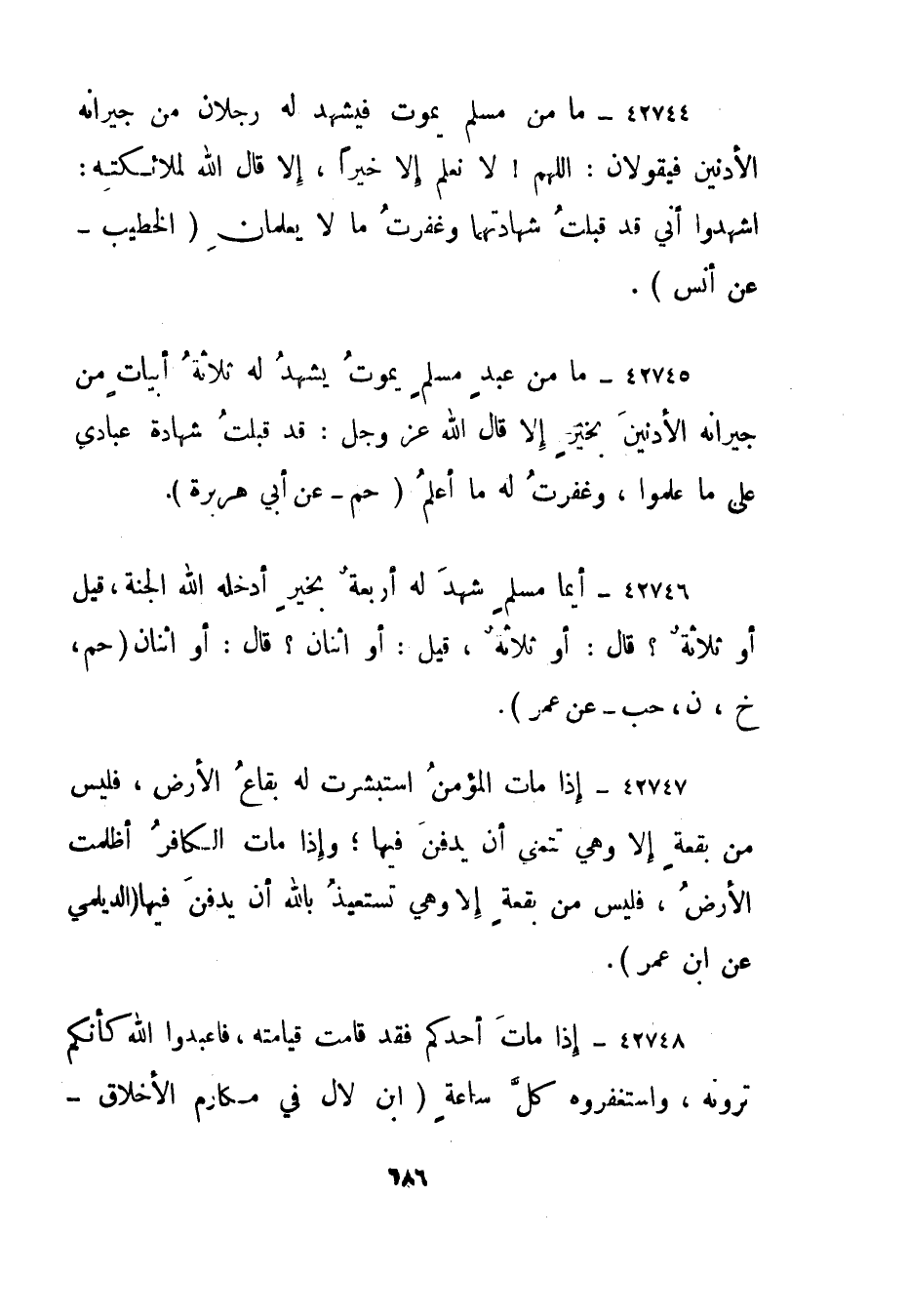 42744- ما من مسلم يموت فيشهد له رجلان من جيرانه الأدنين فيقولان: اللهم! لا نعلم إلا خيرا، إلا قال الله لملائكته: اشهدوا أني قد قبلت شهادتهما وغفرت ما لا يعلمان."الخطيب - عن أنس".