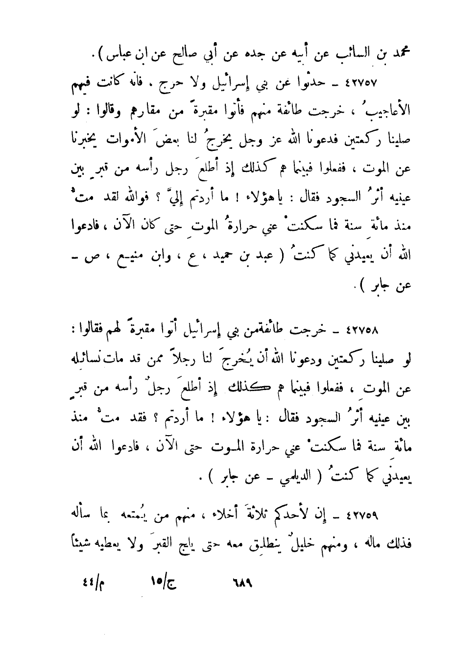 42757- حدثوا عن بني إسرائيل ولا حرج، فإنه كانت فيهم الأعاجيب، خرجت طائفة منهم فأتوا مقبرة من مقابرهم وقالوا: لو صلينا ركعتين فدعونا الله عز وجل يخرج لنا بعض الأموات يخبرنا عن الموت، ففعلوا فبينما هم كذلك إذ أطلع رجل رأسه من قبر بين عينيه أثر السجود فقال: يا هؤلاء! ما أردتم إلي؟ فوالله لقد مت منذ مائة سنة فما سكنت عني حرارة الموت حتى كان الآن، فادعوا الله أن يعيدني كما كنت."عبد بن حميد، ع، وابن منيع، ص - عن جابر".