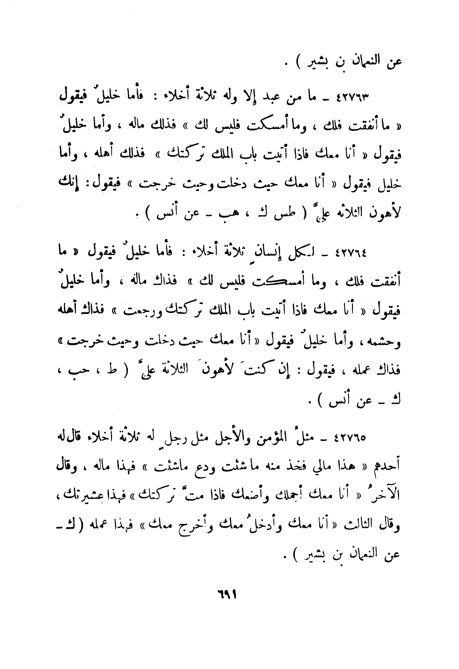 42764- ل كل إنسان ثلاثة أخلاء: فأما خليل فيقول "ما أنفقت فلك، وما أمسكت فليس لك" فذاك ماله، وأما خليل فيقول "أنا معك فإذا أتيت باب الملك تركتك ورجعت" فذاك أهله وحشمه، وأما خليل فيقول "أنا معك حيث دخلت وحيث خرجت" فذاك عمله، فيقول: إن كنت لأهون الثلاثة علي."ط، حب، ك - عن أنس".