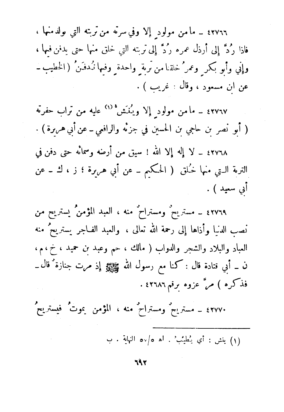 42769- مستريح ومستراح منه، العبد المؤمن يستريح من نصب الدنيا وأذاها إلى رحمة الله تعالى، والعبد الفاجر يستريح منه العباد والبلاد والشجر والدواب."مالك، حم وعبد بن حميد، خ، م، ن - أبي قتادة قال: كنا مع رسول الله صلى الله عليه وسلم إذ مرت جنازة قال - فذكره" مر عزوه برقم 42686.