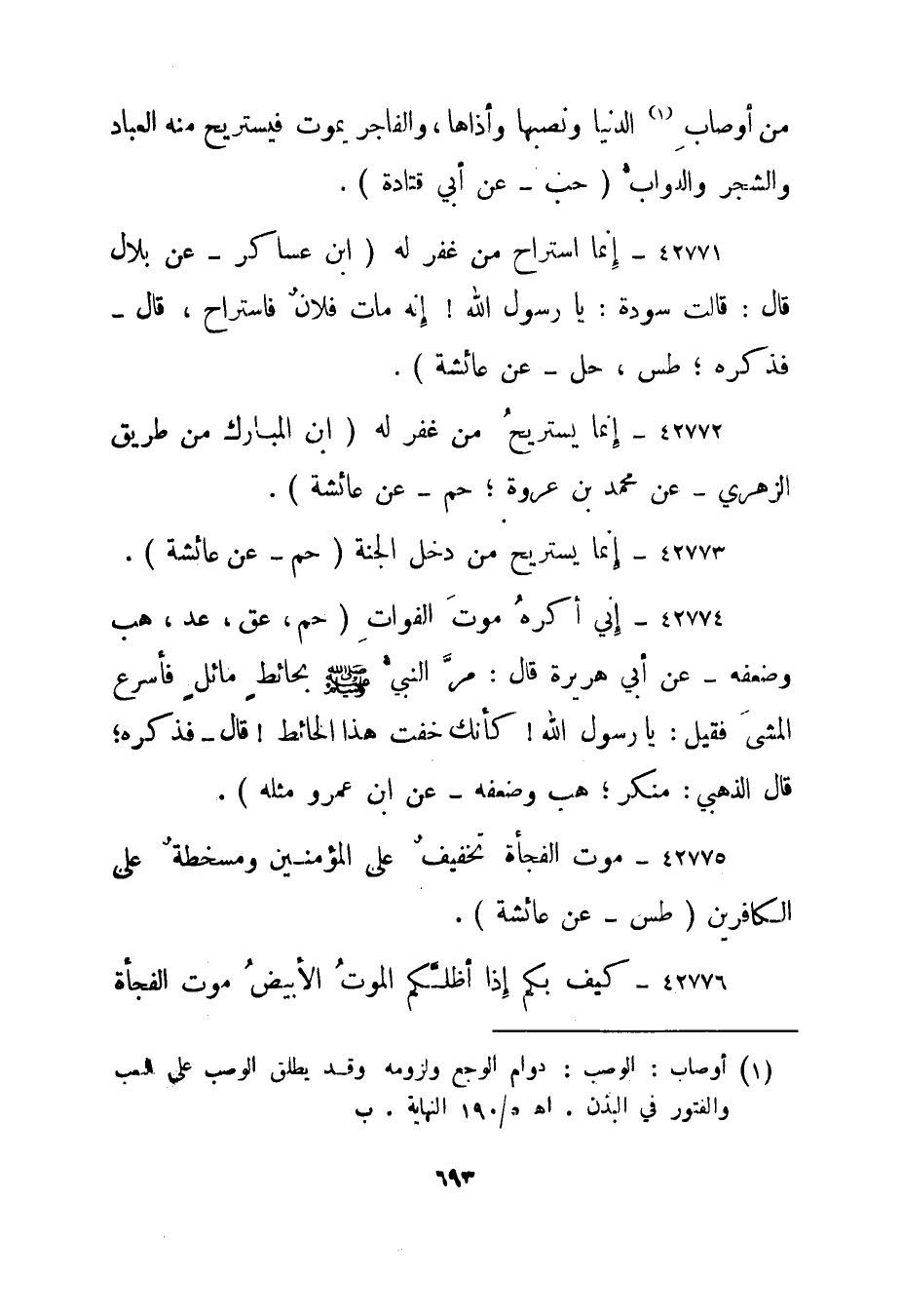 42772- إنما يستريح من غفر له."ابن المبارك من طريق الزهري - عن محمد بن عروة؛ حم - عن عائشة".