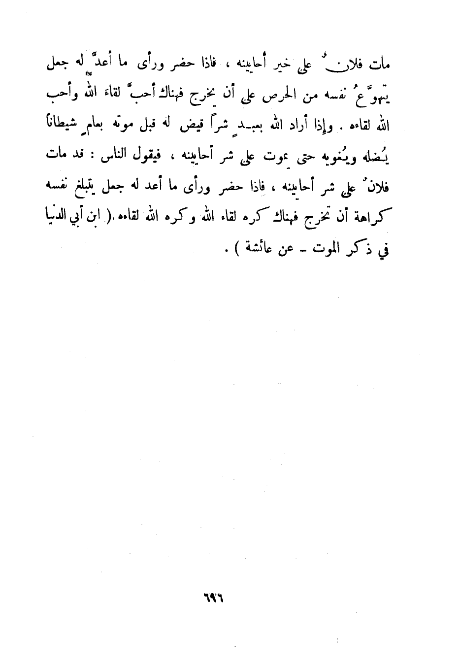 مات فلان على خير أحايينه، فإذا حضر ورأى ما أعد له جعل يتهوع نفسه من الحرص على أن يخرج فهناك أحب لقاء الله وأحب الله لقاءه. وإذا أراد الله بعبد شرا قيض له قبل موته بعام شيطانا يضله ويغويه حتى يموت على شر أحايينه، فيقول الناس: قد مات فلان على شر أحايينه، فإذا حضر ورأى ما أعد له جعل يتبلغ نفسه كراهة أن تخرج فهناك كره لقاء الله وكره الله لقاءه."ابن أبي الدنيا في ذكر الموت - عن عائشة".