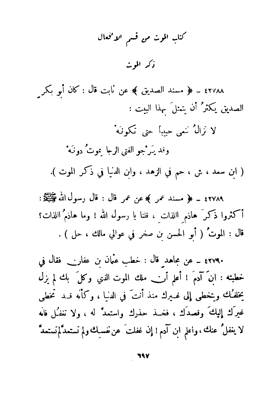 42789- مسند عمر عن عمر قال: قال رسول الله صلى الله عليه وسلم: أكثروا ذكر هاذم اللذات، قلنا يا رسول الله! وما هاذم اللذات؟ قال: الموت."أبو الحسن بن صخر في عوالي مالك، حل".
