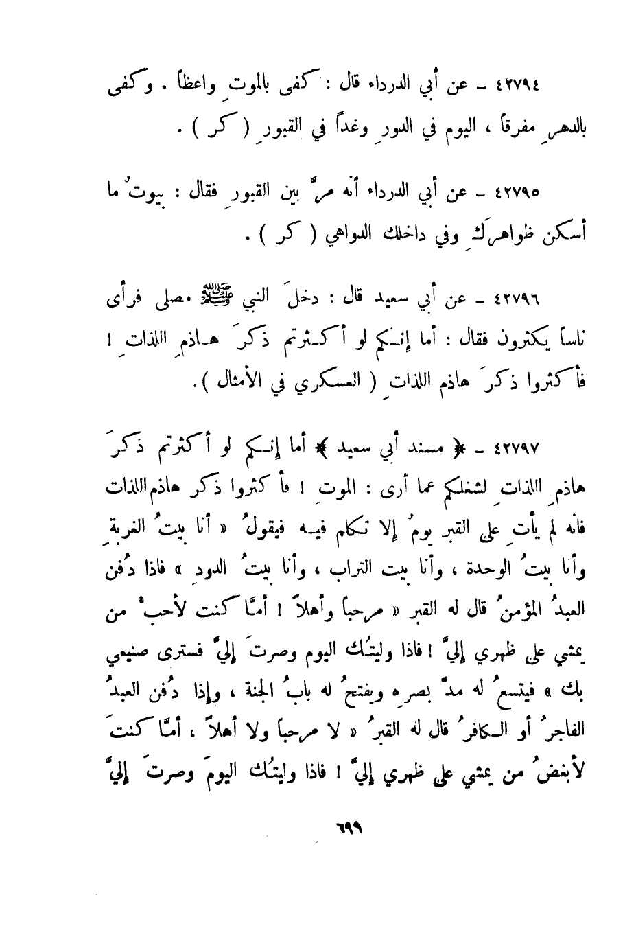 42796- عن أبي سعيد قال: دخل النبي صلى الله عليه وسلم مصلى فرأى ناسا يكثرون فقال: أما إنكم لو أكثرتم ذكر هاذم اللذات! فأكثروا ذكر هاذم اللذات."العسكري في الأمثال".