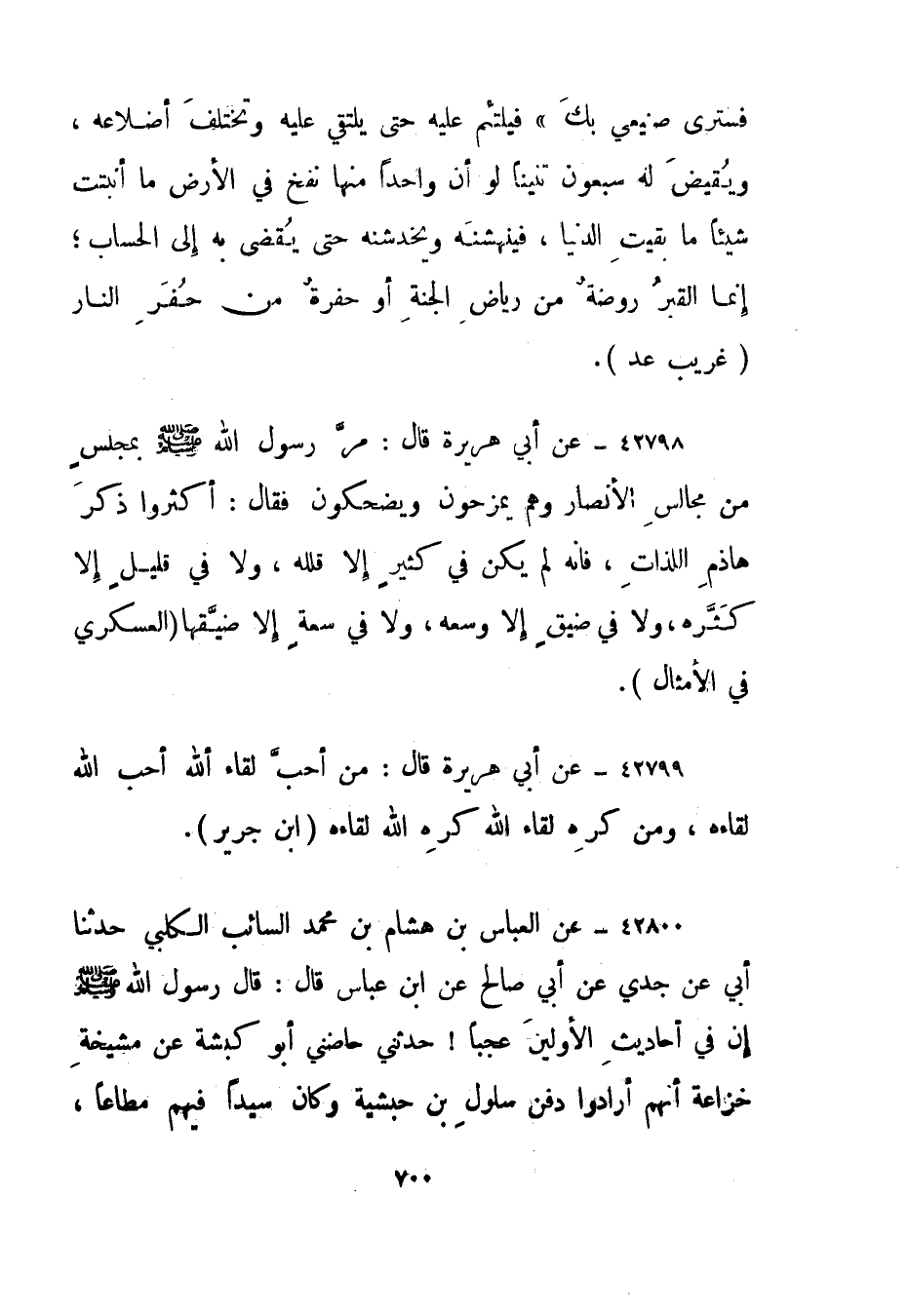 42799- عن أبي هريرة قال: من أحب لقاء الله أحب الله لقاءه، ومن كره لقاء الله كره الله لقاءه."ابن جرير".